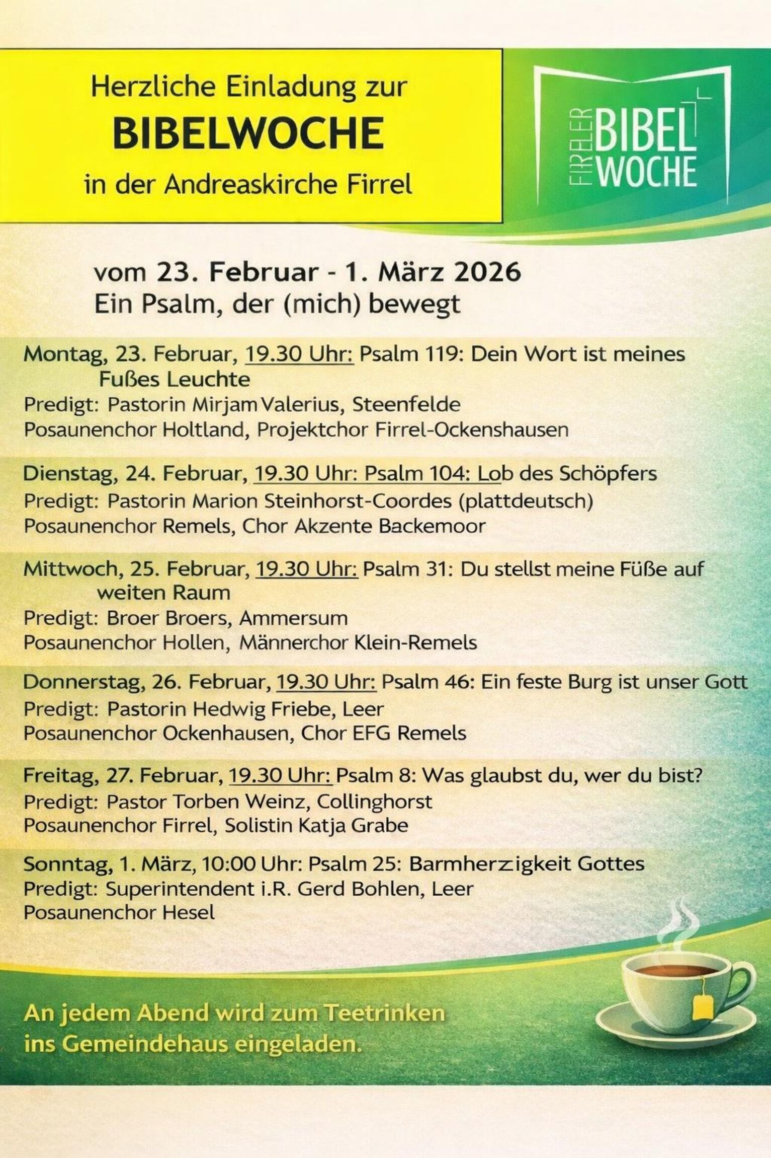 Wir sind die Andreasgemeinde in Firrel, Neufirrel und Schwerinsdorf. Wir sind benannt nach Andreas aus der Bibel: Als Jesus ihm begegnete, machte Andreas sich auf, um ihm zu folgen. So wollen auch wir als Gemeinde Jesus nachfolgen und Menschen einladen, mit ihm zu gehen.